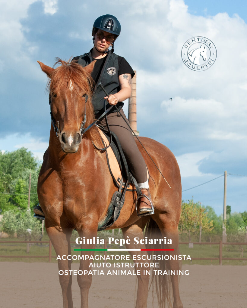 Giulia (Accompagnatore escursionista e aiuto istruttore) si sta specializzando in osteopatia equina e nel recupero di cavalli con problematiche fisiche.